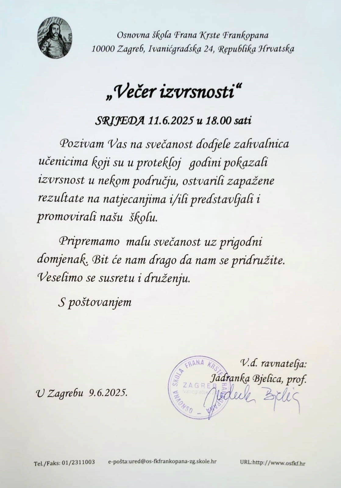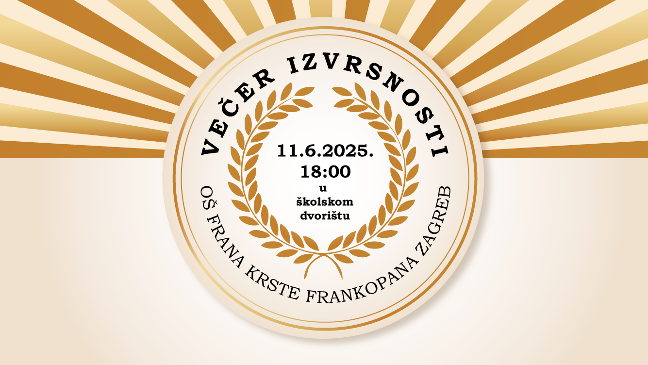 Pozivamo Vas na svečanost dodjele zahvalnica učenicima koji su u protekloj godini pokazali izvrsnost u nekom području, ostvarili zapažene rezultate na natjecanjima i/ili predstavljali i promovirali našu školu.